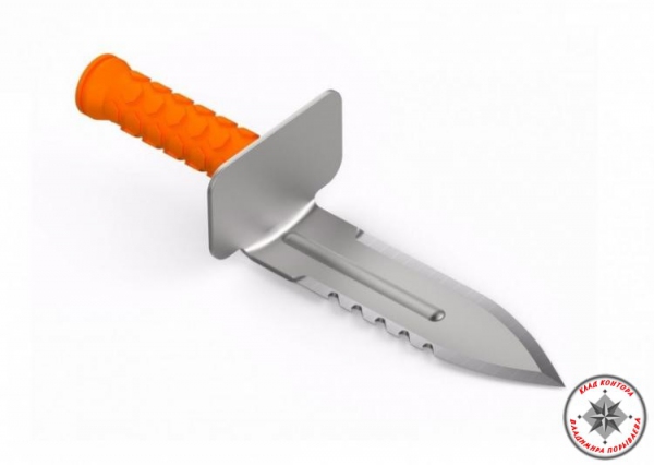 Компактная лопатка с зазубринами по одной из сторон и прорезиненной рифленой ручкой оранжевого цвета в комплекте с ножнами.